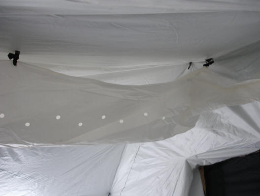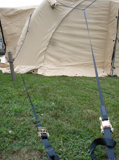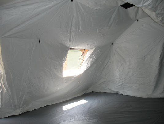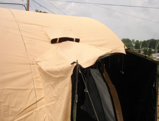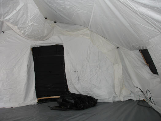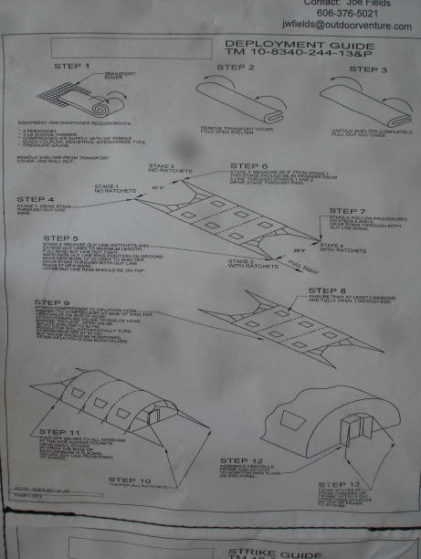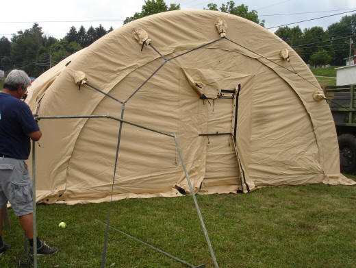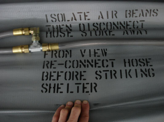 using a commercial air compressor. Two to three people can deploy the shelter in less than fifteen minutes. The shelter is deployed and struck